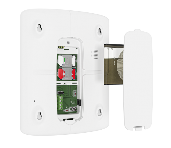 Резервная аккумуляторная батарея и SIM-карты расположены под отдельной сервисной крышкой. Для их замены или обслуживания прибор необходимо снять со стены — разборка корпуса при этом не требуется.